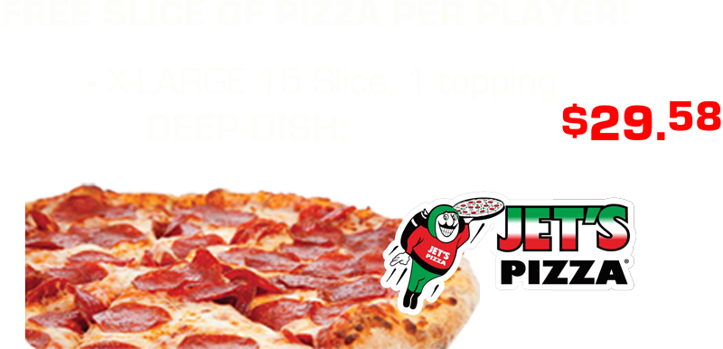 Now, everyone gets a FREE slice of pizza on us. However, if you want more, nothing is cheaper and feeds hungry mouths better than hot Gourmet pizza, and we have a deal for you from Jet's Pizza, only $29.58 for a X-Large 15 Slice one Topping, DEEP-DISH pizza delivered!